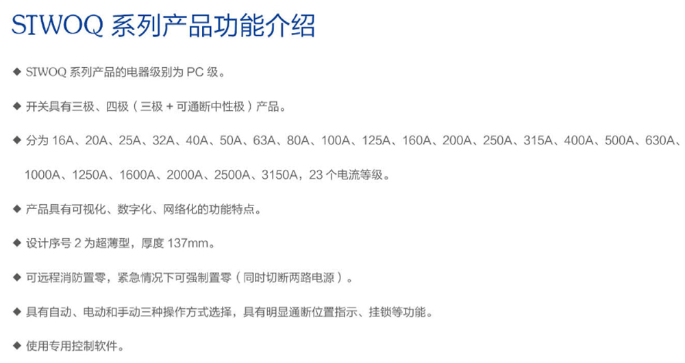 斯沃電器有限公司主要產品有雙電源自動轉換、負荷隔離開關、隔離開關熔斷器組、萬能式斷路器、塑殼斷路器、小型斷路器、交流接觸器等低壓元器件。服務熱線:18868285599
